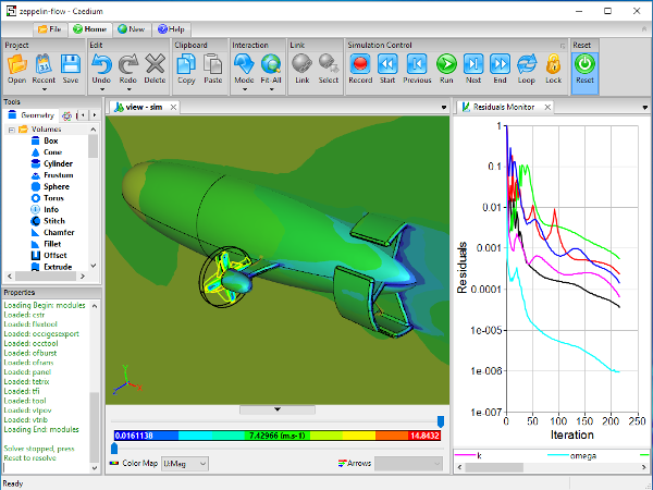 If all is well then you can now proceed to toggle Simulation Control->Run, which will perform the number of steps as configured by the simulation Time->Duration property. The results will be updated automatically at the end of each step. To extend the number of simulation steps then increase Substance->Solver:RANS Flow->Iterations.